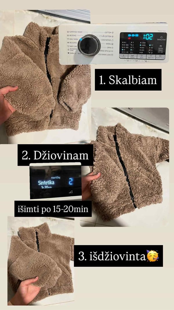 2. Džiovinimas – galima džiovinti džiovyklėje, pasirinkus „Sintetika“ programą. Rekomenduojama išimti po 15–20 min., kad išliktų pūkuotumas.